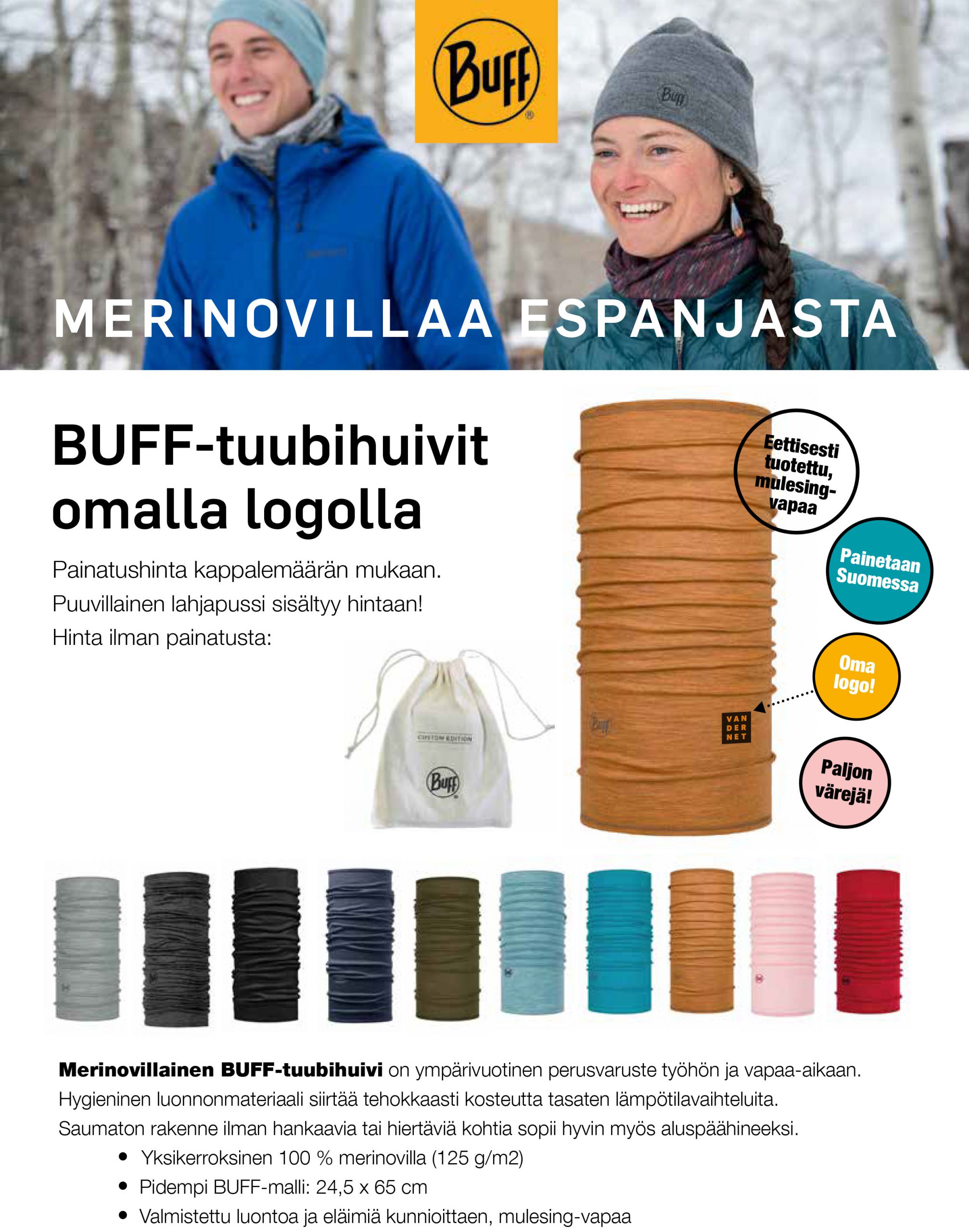 Merinovillainen BUFF-tuubihuivi on ympärivuotinen perusvaruste työhön ja vapaa-aikaan. Hygieeninen luonnonmateriaali siirtää tehokkaasti kosteutta tasaten lämmönvaihteluita. Saumaton rakenne ilman hankaavia tai hiertäviä kohtia sopii hyvin myös aluspäähineeksi.