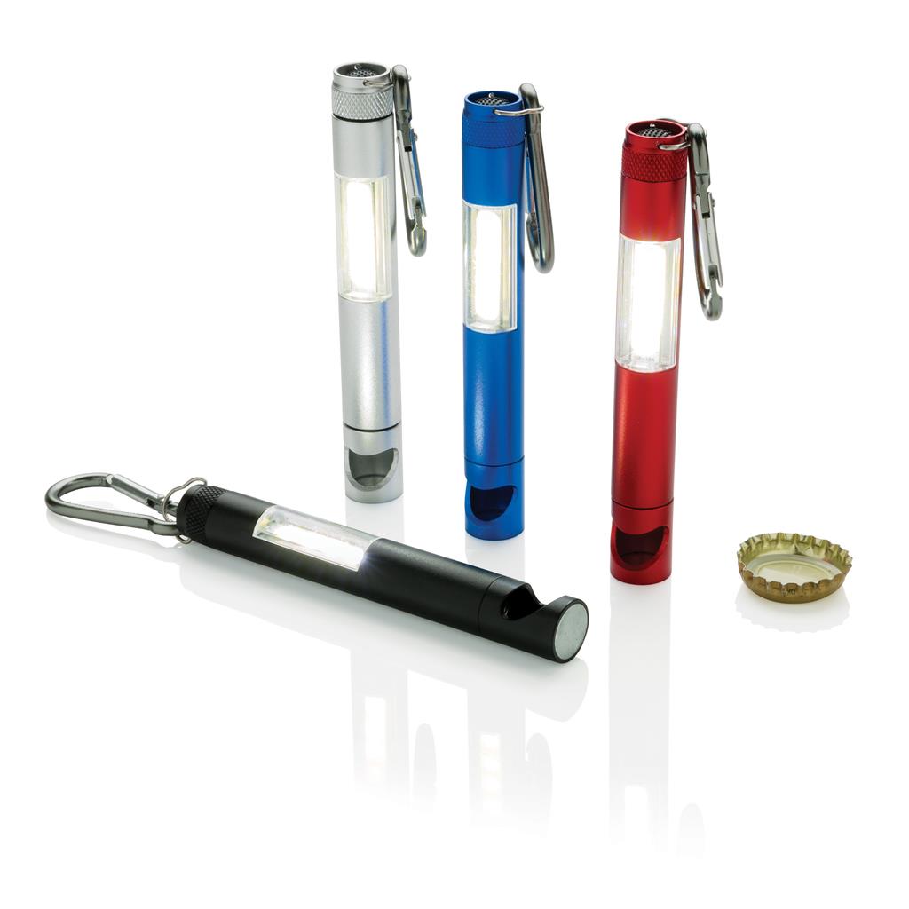 Erittäin kirkas 1W COB taskulamppu pullonavaajalla ja ripustinkoukulla. Sisältää patterit.