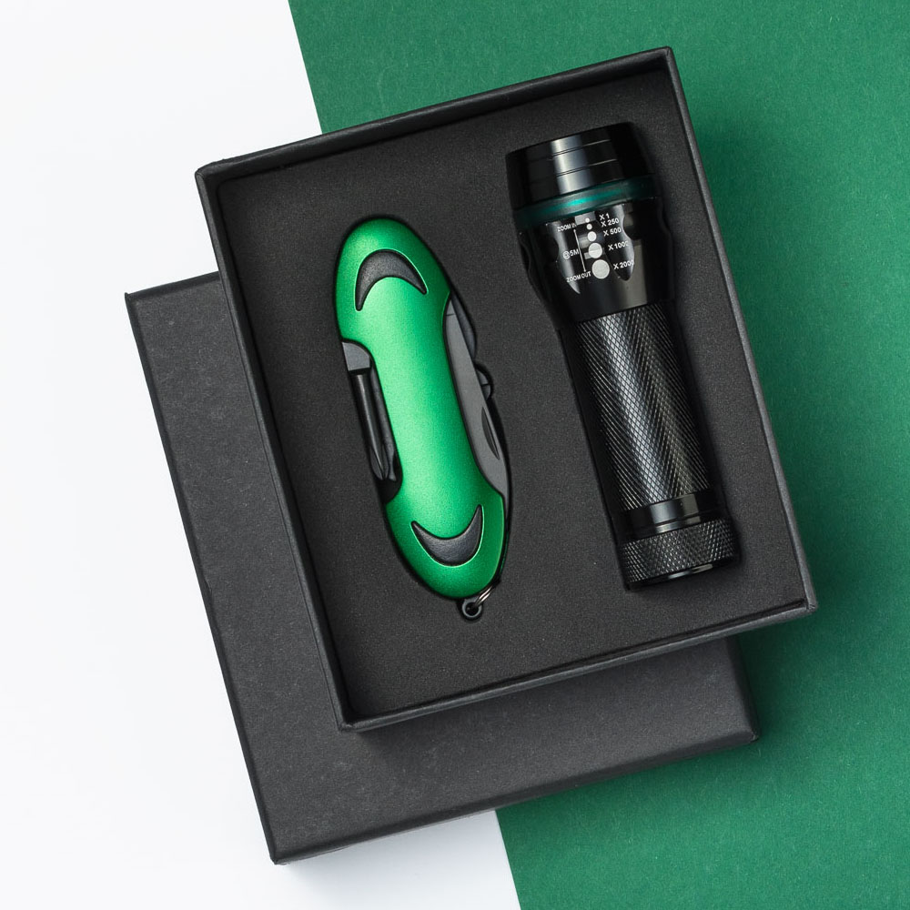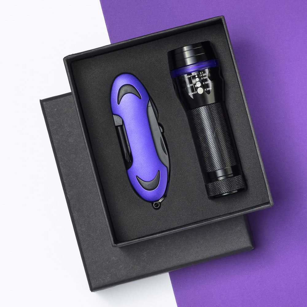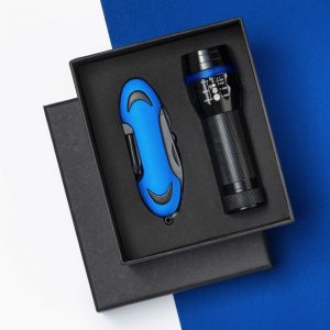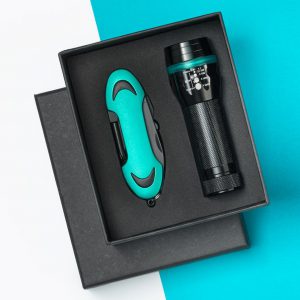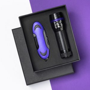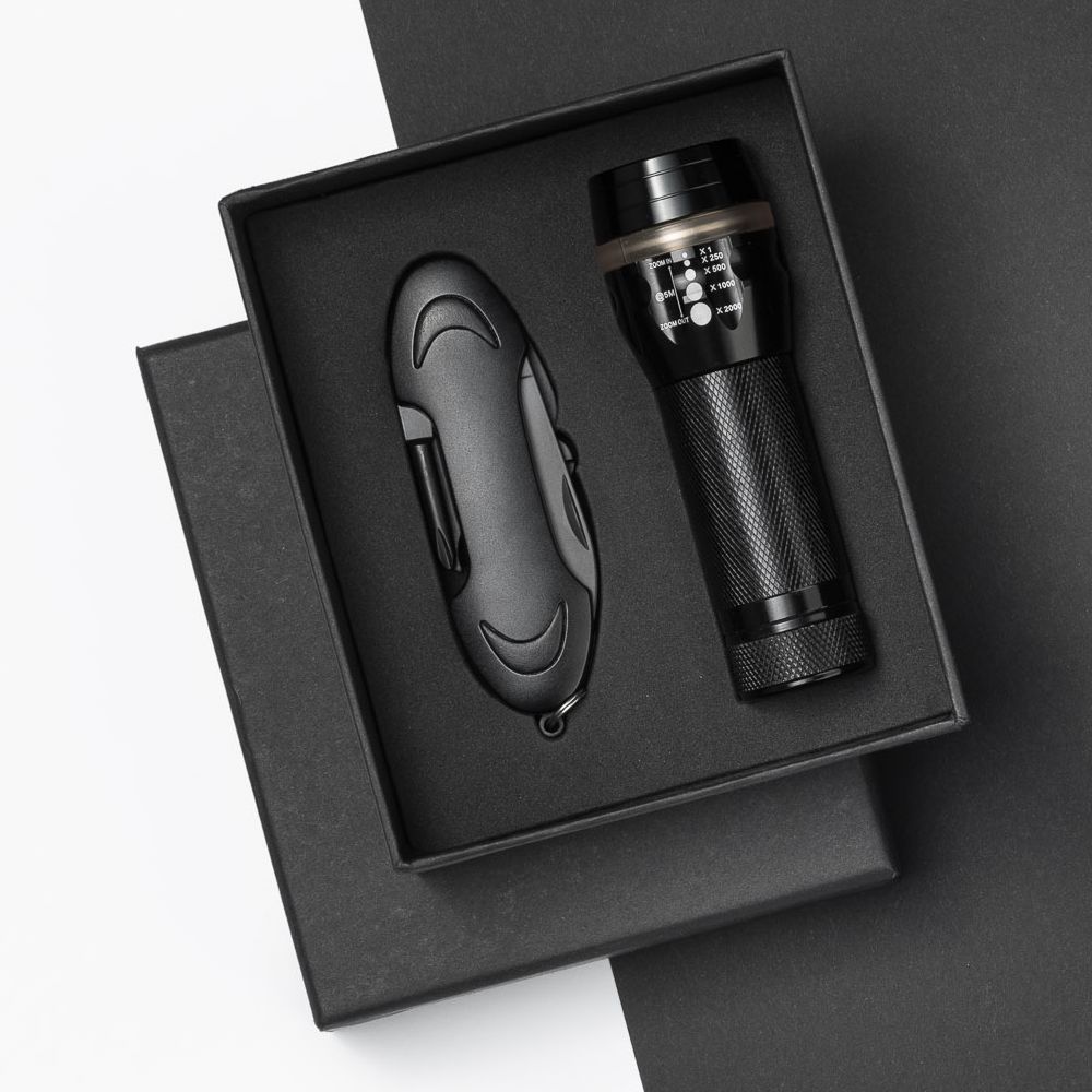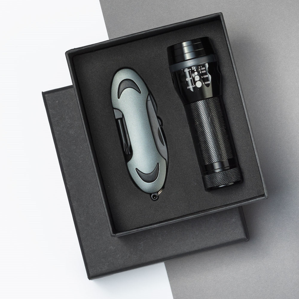 Käytännöllinen lahjapakkaus, joka sisältää taskuveitsen ja LED-taskulampun. Taskulampussa on zoom-toiminto sekä vilkkuva hälytysvalo. Taskulamppu toimii kolmella AAA-paristolla, jotka toimitetaan mukana. Taskuveitsestä löytyy korkkiruuvi, pullonavaaja, ruuvimeisseli sekä kynsiviila ja -sakset. 9 värivaihtoehtoa. Tyylikäs musta lahjapakkaus.