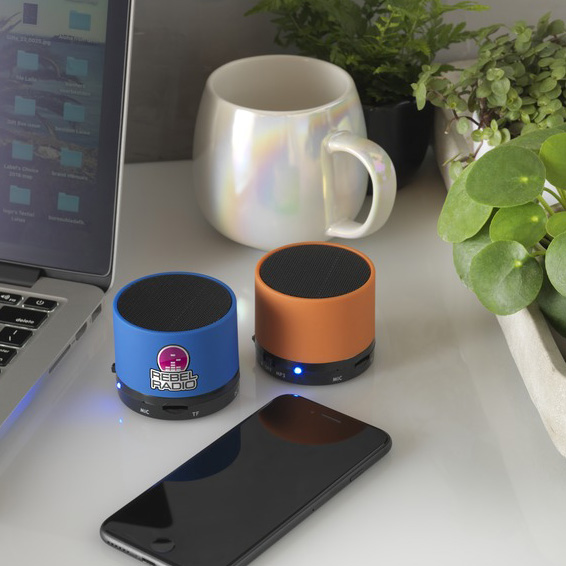 Kuminen sylinterikaiutin. Nauti musiikista ja elokuvista missä tahansa yhdistämällä Bluetooth® -yhteensopivaan laitteeseen, kuten iPhone-, iPad- tai Android OS-laitteeseen tämä kannettava Bluetooth®-kaiutin (10m säteellä). Sisäänrakennetulla mikrofonilla varustettu kaiutin mahdollistaa konferenssipuhelut älypuhelimesi kautta, tai videopuheluohjelmilla kuten Skypellä. Viimeistelty hienolla kumilla. USB-virtalähde mukana. ABS Muovi.