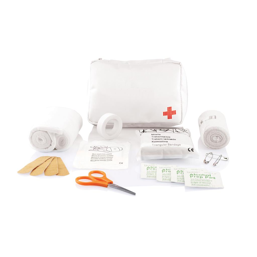 Postitettavaksikin sopiva ensiapupakkaus (200 g). Sisältää mm. sidetarpeita, laastareita, muovikäsineet ja sakset. EN 13485:2003.