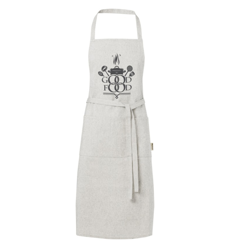 Kierrätetystä puuvilla-polyesteriseoksesta valmistettu esiliina. Kaksi vierekkäistä taskua, joiden yhteiskoko on 45 x 20 cm ja metrin pituiset sidontanauhat. Kierrätetty puuvilla tuotetaan valmistusmateriaalin ylijäämästä, jota syntyy tekstiilitehtaissa leikkaamisen aikana. Kierrätetyn puuvillan ominaisuuksista johtuen väri saattaa vaihdella hieman. Niskahihnan pituus: 55 cm.