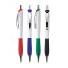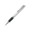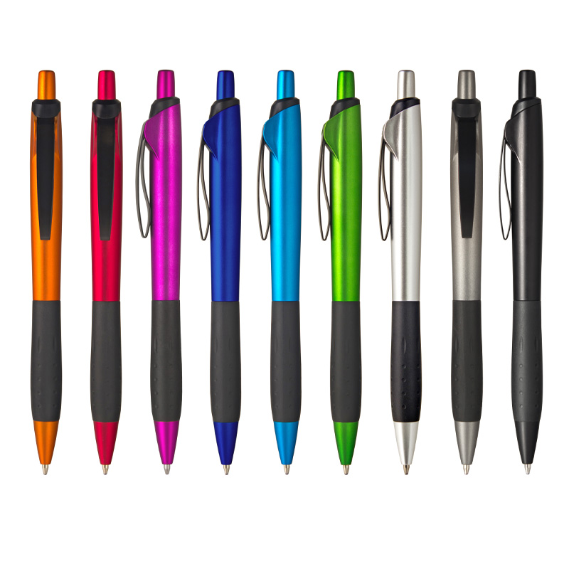 Metallivärinen kuulakärkikynä taipuisalla mustalakatulla klipsillä ja gripillä. Sininen muste.