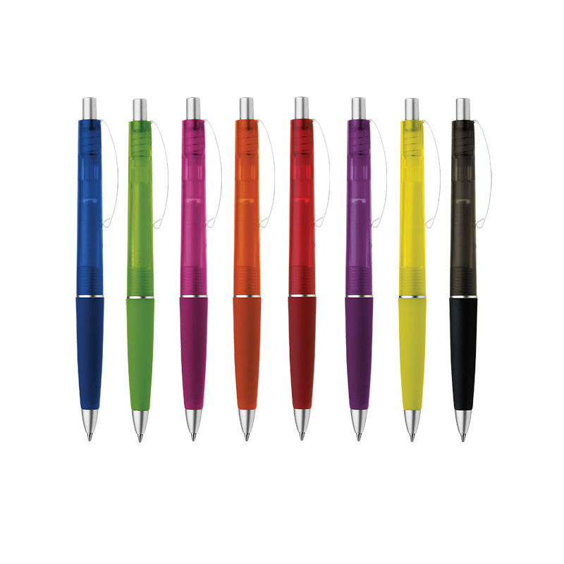 Suosittu kuulakynä läpinäkyvällä rungolla ja samanvärisellä kumisella pidinosalla. Mattametalli klipsi, nuppi ja kynän pää. Painomekanismi. Trendikkäät värivaihtoehdot!