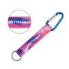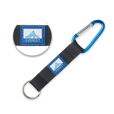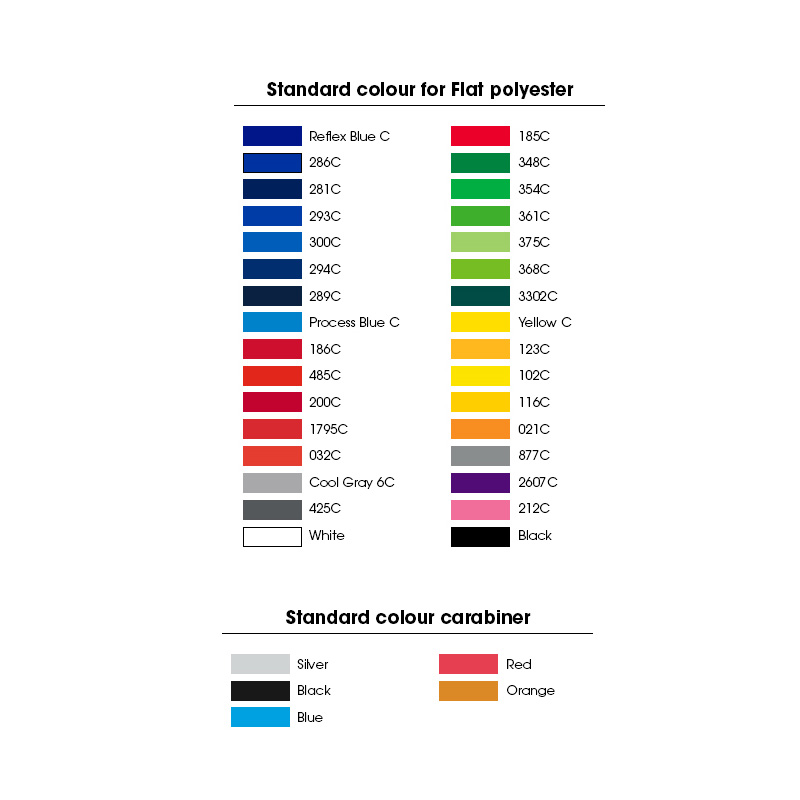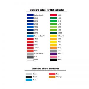 Avaimenperä karbiinihaalla ja metallirenkaalla. Nauhaan 4-värinen PVC merkki. 5 vakioväriä karabiineihin; punainen, oranssi, sininen, hopea, musta.