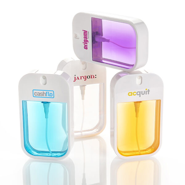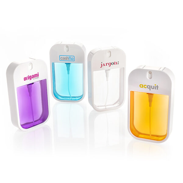 Suihkutettava käsidesi trendikkäissä pulloissa. Kätevä taskukoko työpöpydälle, käsilaukkuun, autoon jne.