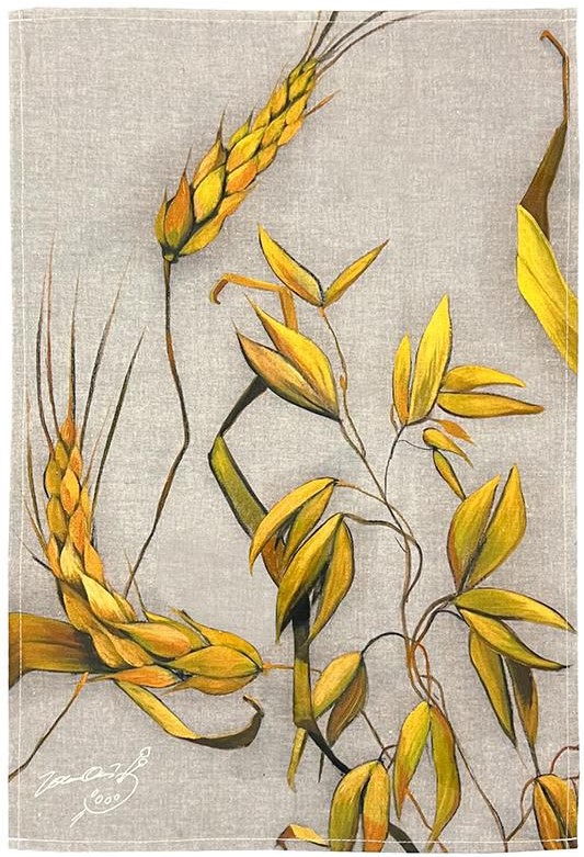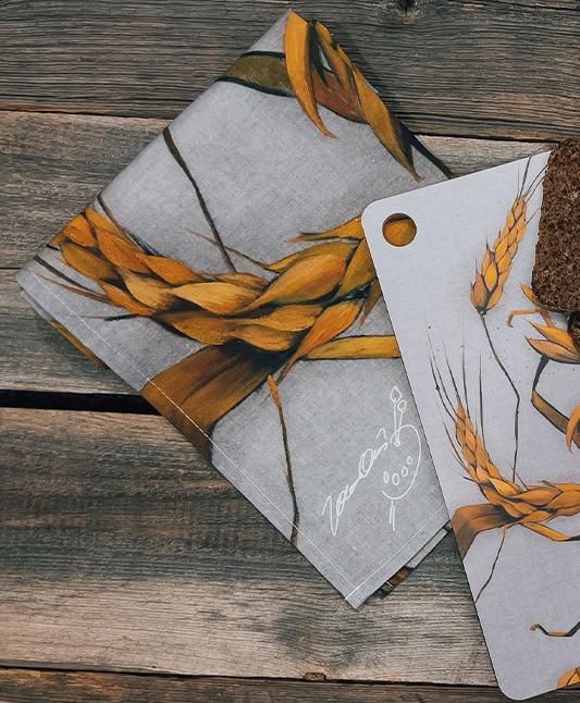 Ja minä olen viljaa -nimistä laadukasta kotimaista keittiöpyyhettä voi käyttää niin astiapyyhkeenä kuin leivinliinanakin ja sen voi yhdistää käytännölliseen leikkuulautaan.