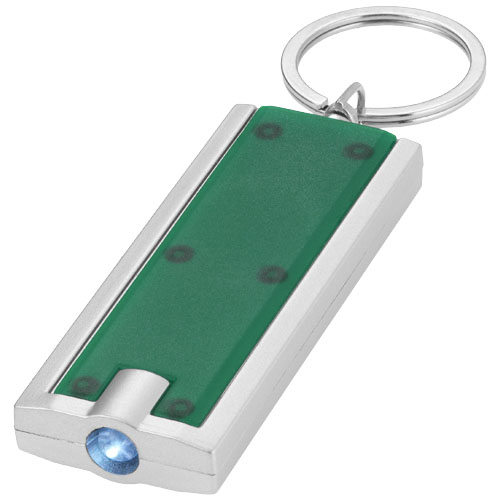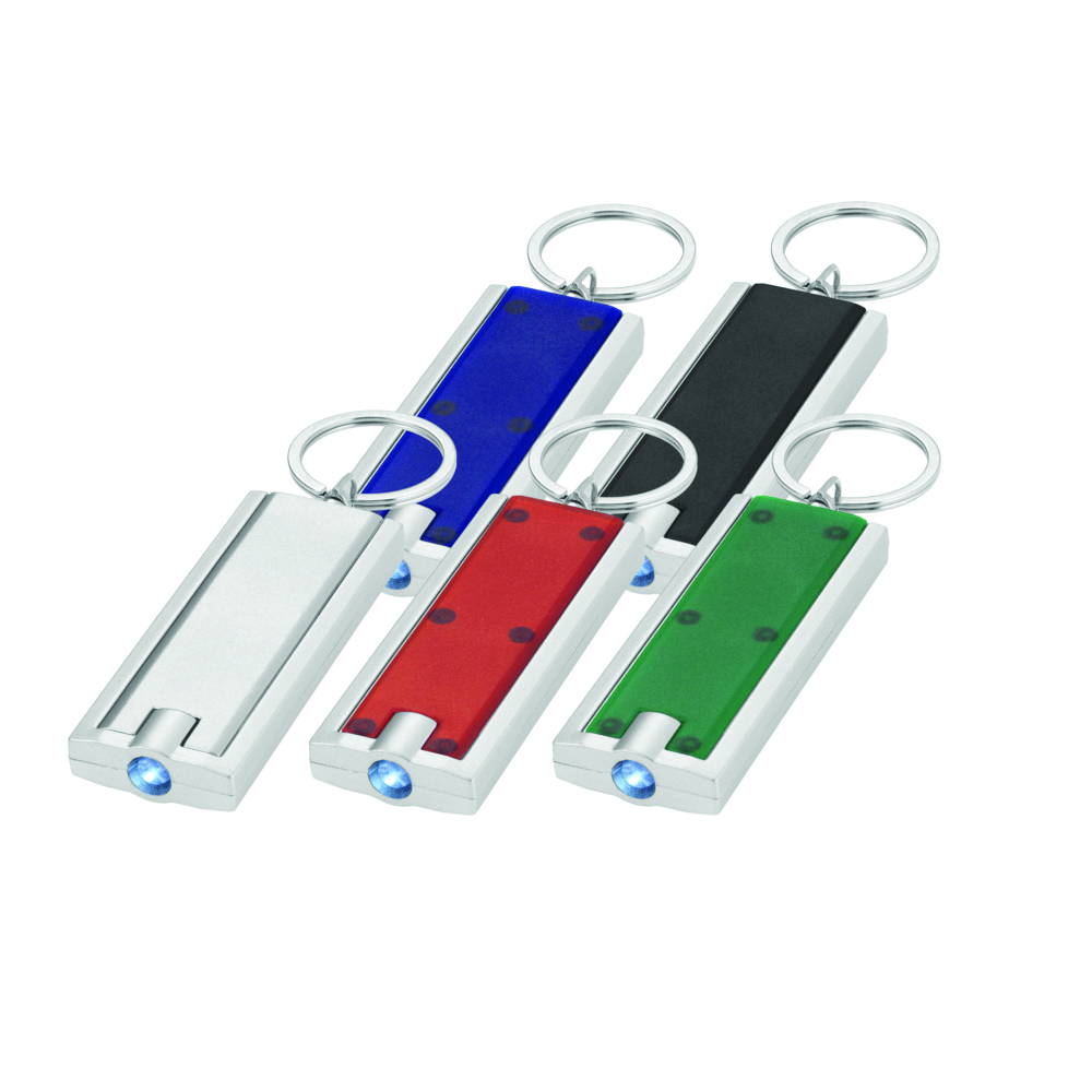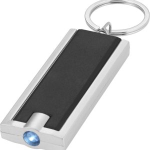 Avainvalo, jossa on kirkas, valkoinen LED-valo ja virtapainike. Metalliavainrengas. Mukana paristot. ABS-muovi.