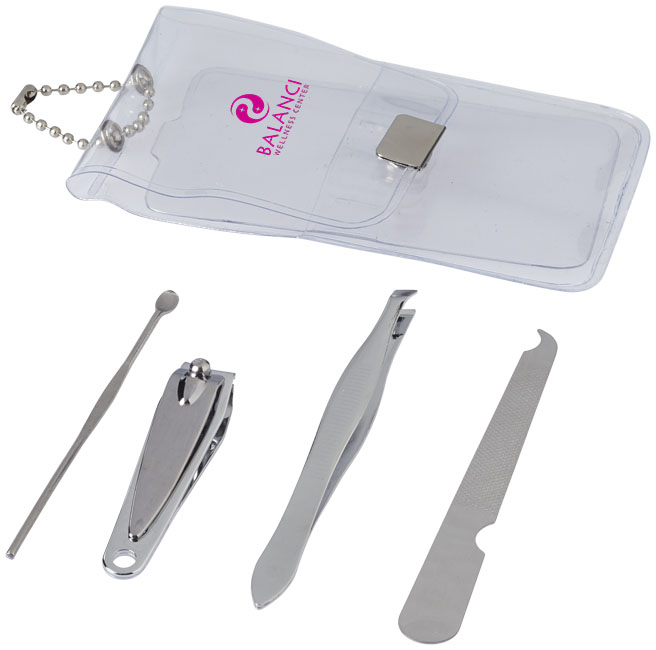 Manikyyrisetti, joka sisältää kynsiviilan, kynsileikkurit, pinsetit ja kynsinauhaveitsen.
