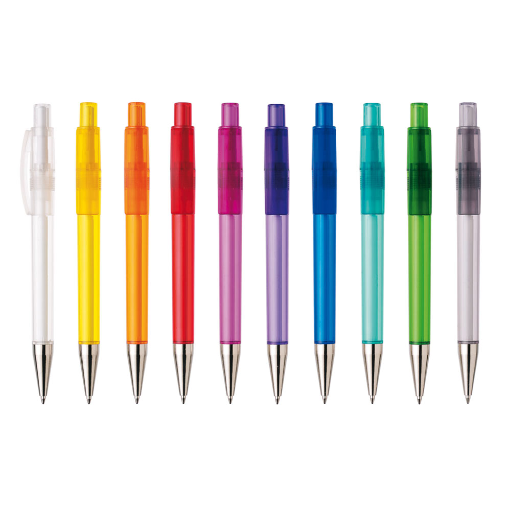 Next Clear Chrome on klassisen tyylikäs mainoskynä. Suuri painopinta-ala rungossa ja klipsissä. Läpinäkyvä runko, kynän kärki kromattu. Raikkaat värit!