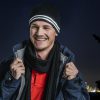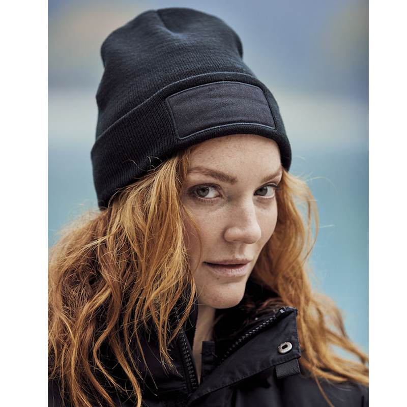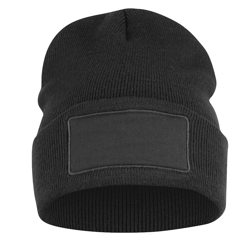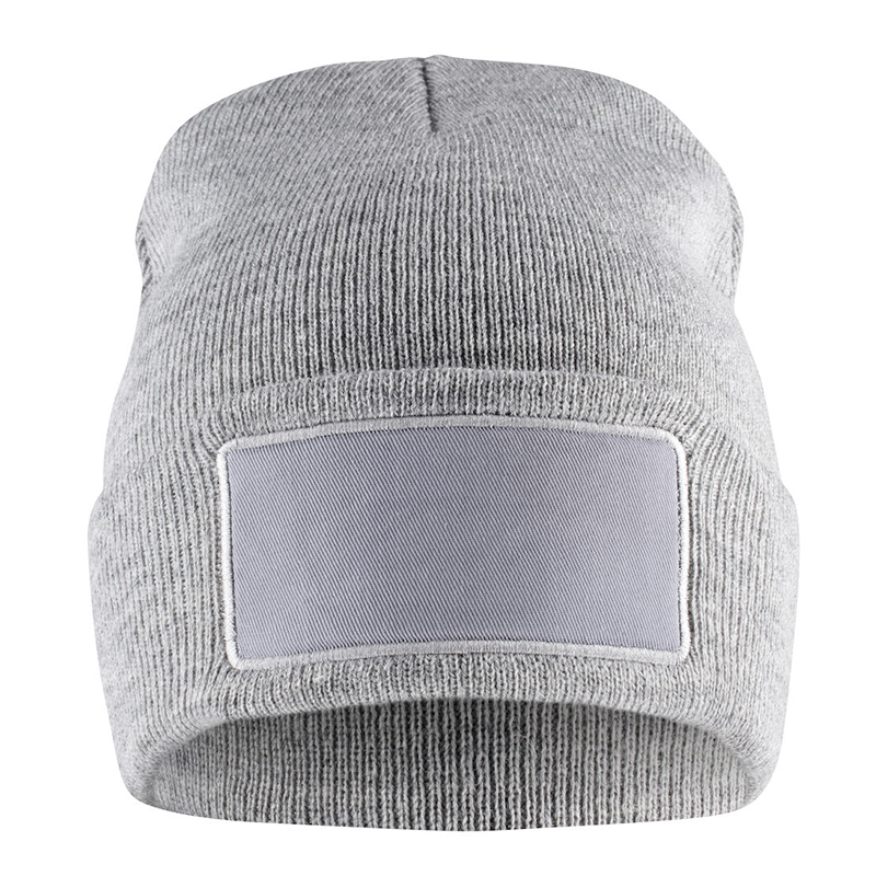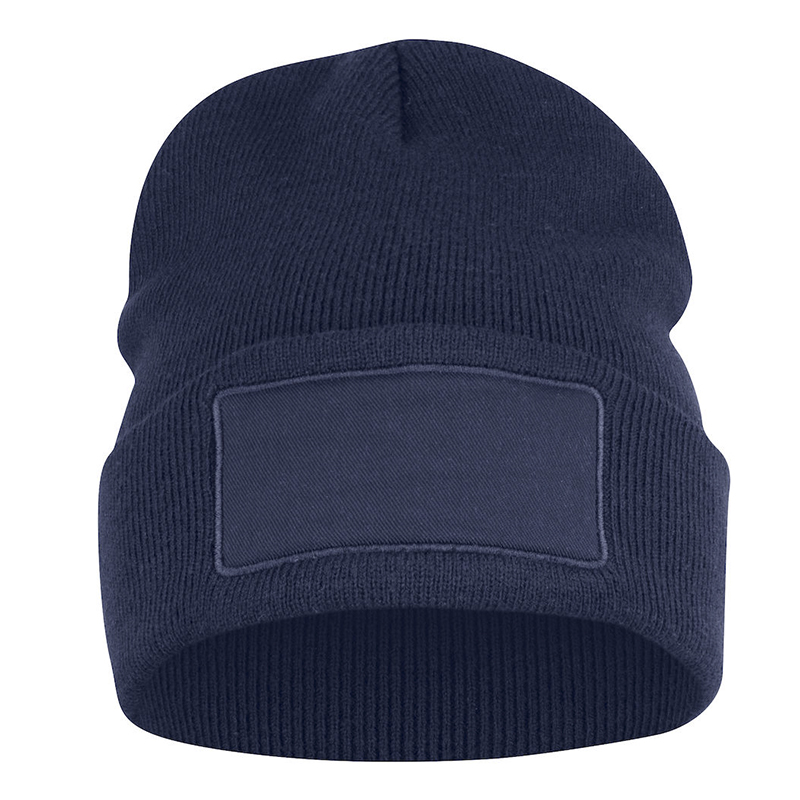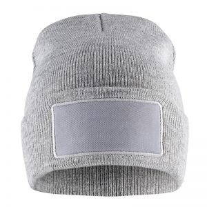 Reunasta käännetty neulospipo. Edessä paikka painatusta varten, koko 4,5 x 9,5 cm.