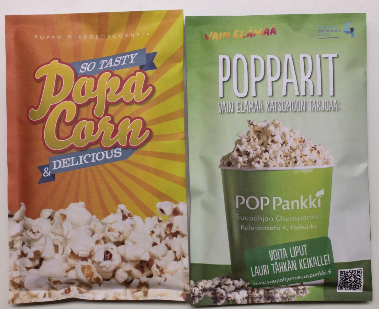 Neliväripainettu pakkaus, jonka sisällä micropopcornpussi.