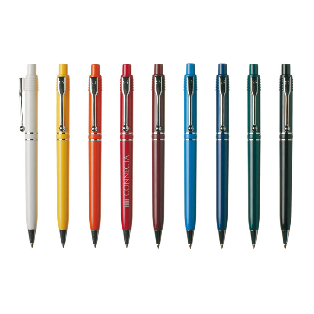 Klassinen kuulakynä jossa värillinen runko ja metallin väriset yksityiskohdat. Laaja painatusalue.