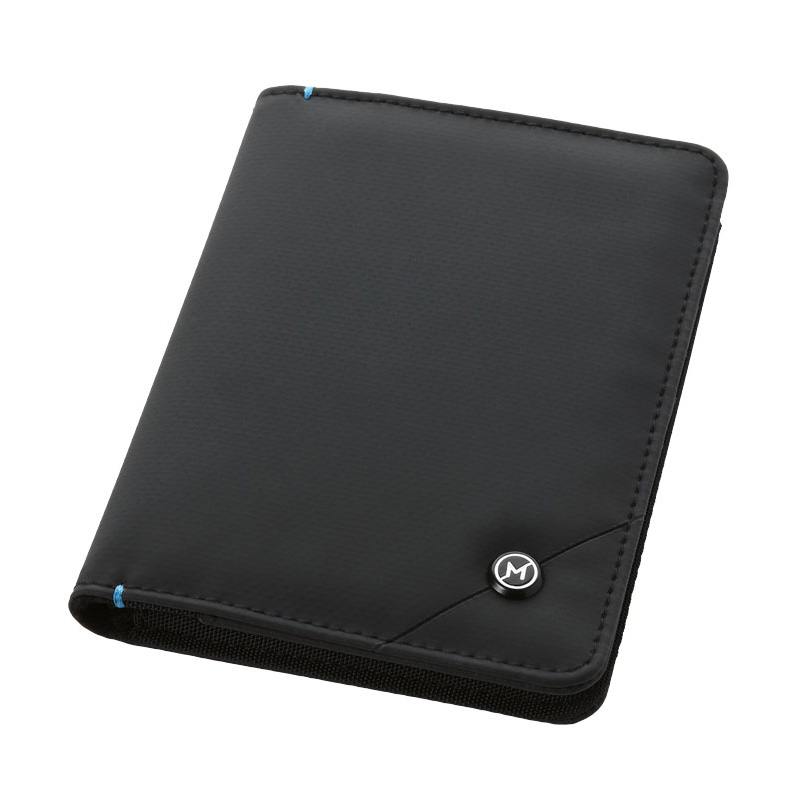 Ylellisesti muotoillussa matkalompakossa on RFID-sisäkerros. Passikoteloon mahtuu kuusi luottokorttia. Siinä on kaksi säilytystaskua, SIM-korttitasku ja passitasku. Väri musta.