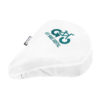 Säilytyspussi, jossa on huurrettu valkoinen takaosa, läpinäkyvä etuikkuna vetoketjulla ja läpällä sekä tarranauhakiinnitys. Kiristysnauha.