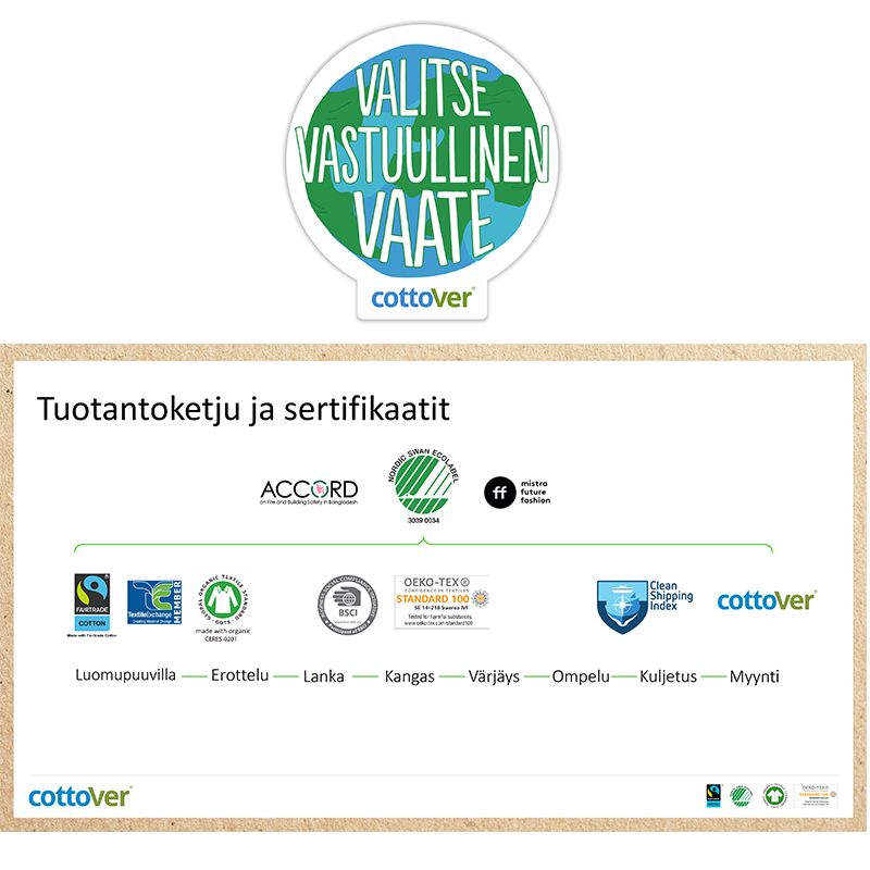 Cottover –malliston vaatteet valmistetaan alusta loppuun kestävää kehitystä ajatellen.Cottover –mallisto on Joutsen-, GOTS- ja ÖKÖ-TEX merkitty ja mallistossa käytetty puuvilla on 100% ekologista ja sillä on Reilunkaupan sertifiointi. Sertifioitu tuote täyttää kyseisen sertifiointiorganisaation kriteerit ja on käynyt läpi riippumattoman tarkastuksen. Cottover –malliston ympäristömerkit kattavat yhdessä koko tuotantoketjun sekä tuotteet, ja osoittavat niiden täyttävän tietyt laatua, terveyttä, ympäristö ja työoloja koskevat vaatimukset.