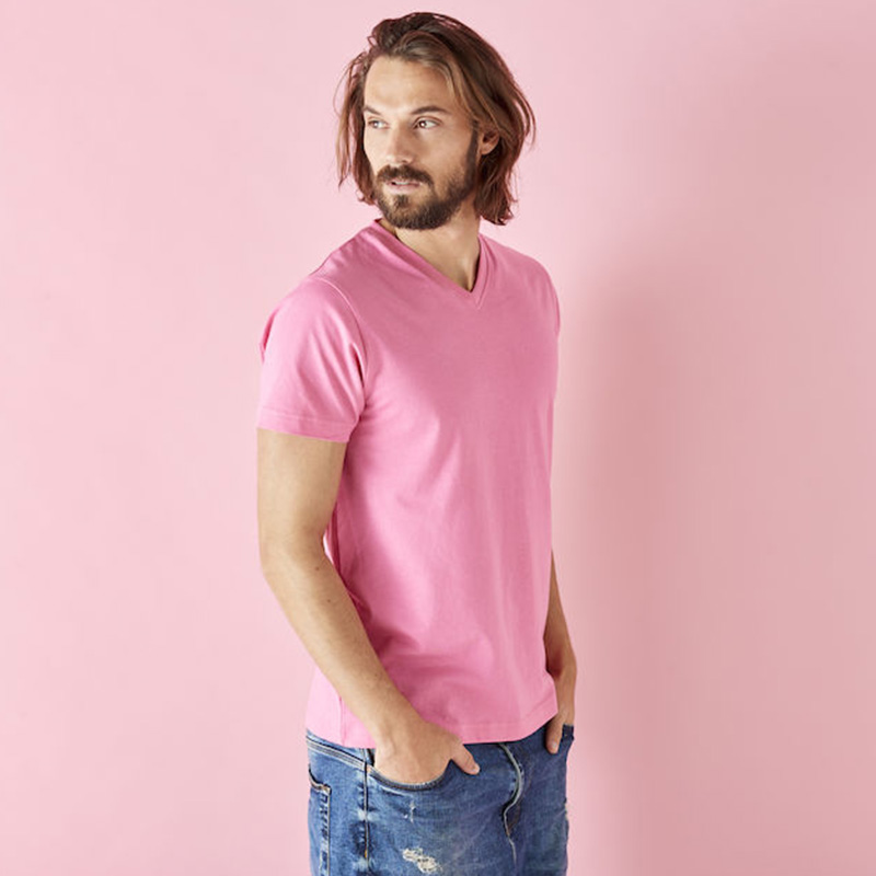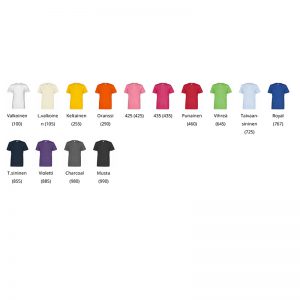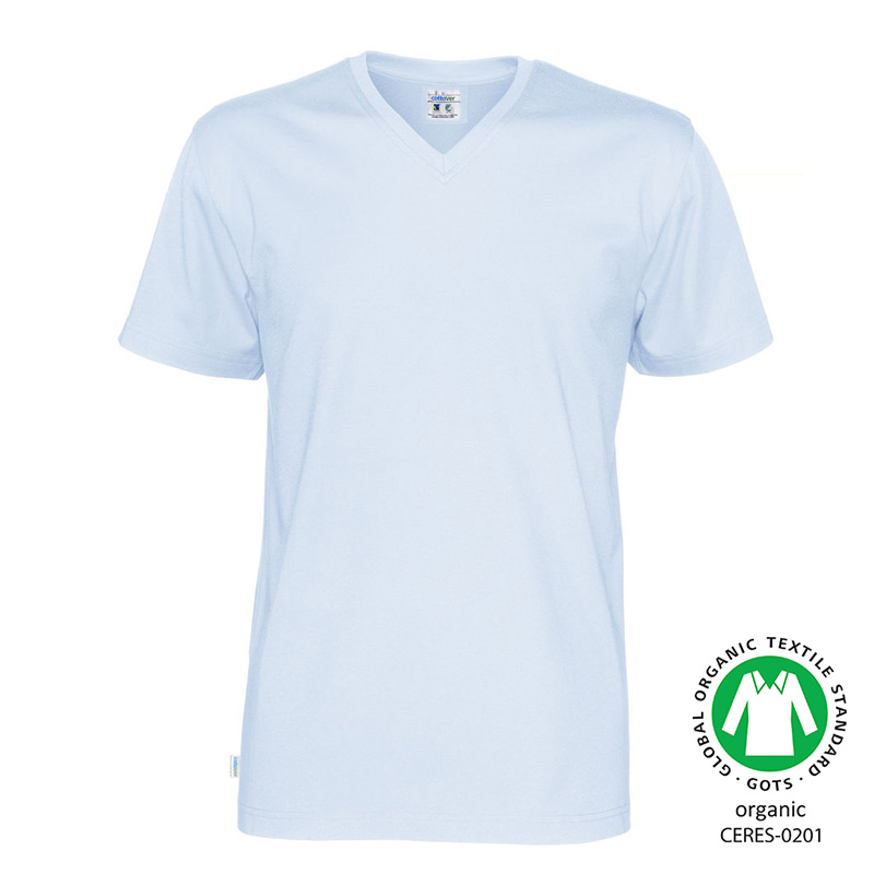 V-aukkoinen T-paita naisten ja miesten mallina. Kavennettu malli, jossa pääntiellä siisti ribbineulos.