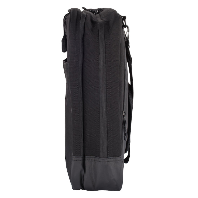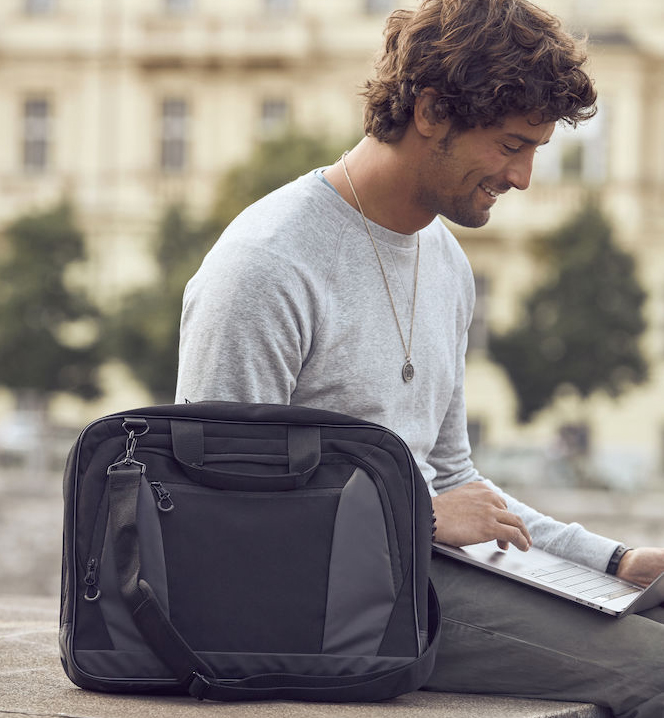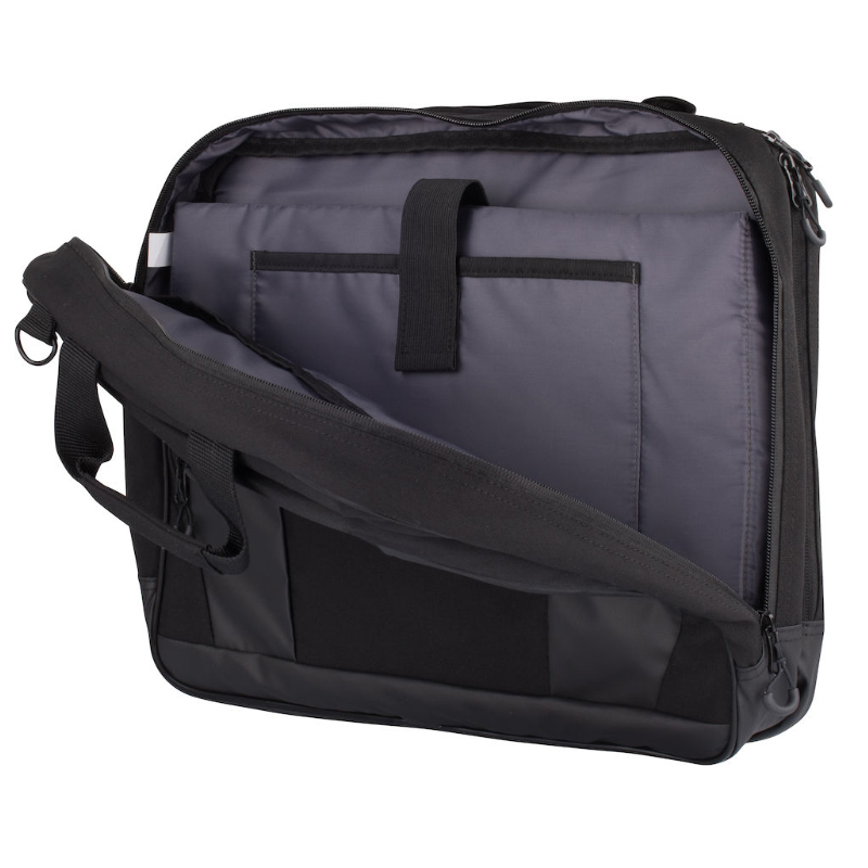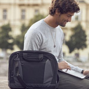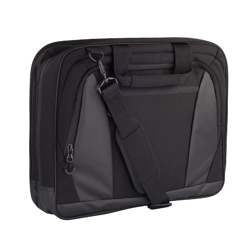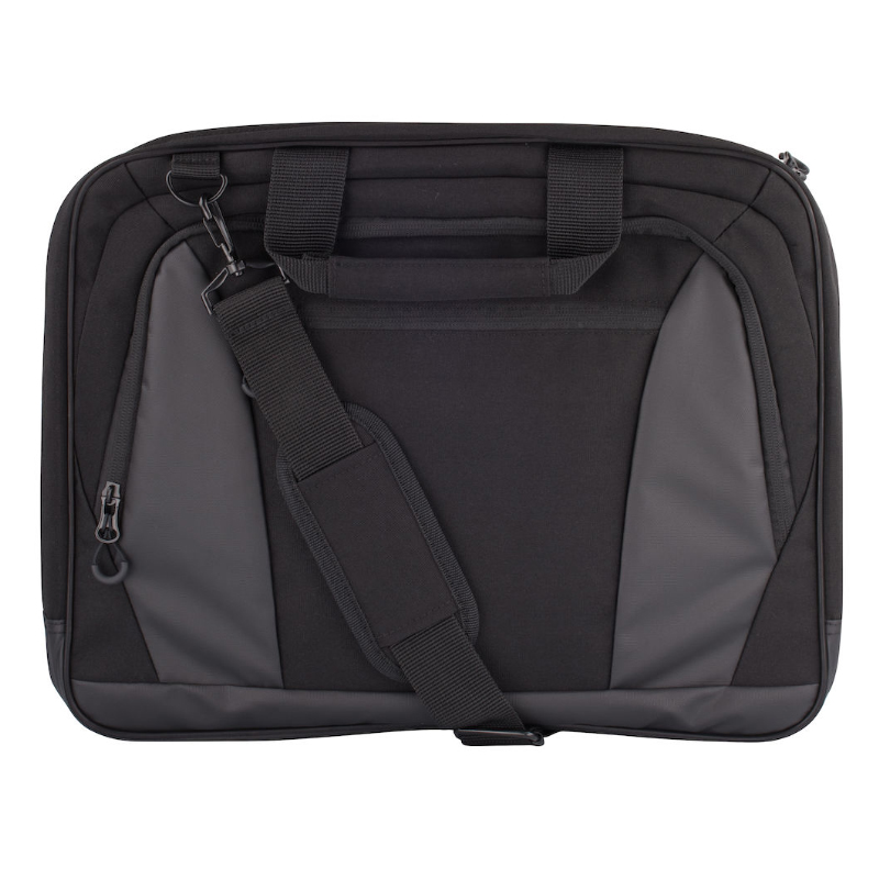 Tyylikäs tietokonelaukku. Kolme suurta osastoa ja pehmustettu tietokonetasku. Sisäpuolella useita taskuja tarvikkeille. Irrotettava viisto olkahihna lisää kantomukavuutta ja siinä on käyntikorttitaskulla varustettu olkapehmuste. Kaksi pehmustettua kantokahvaa ja kaksi suurta vetoketjullista ulkotaskua. Takana on tukeva remmi, josta laukun voi kiinnittää matkalaukun päälle.